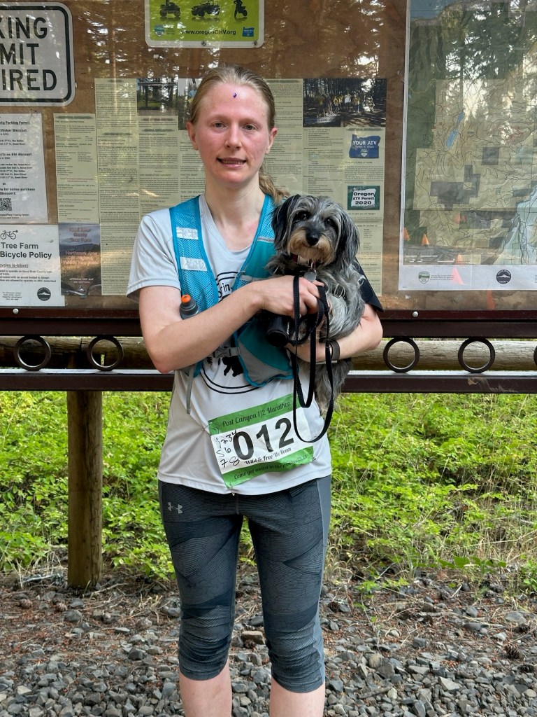 I ran the Post Canyon half marathon yesterday morning and finished in around 2 hours and 28 minutes. The lap setup wasn’t too bad because my husband waited with Margot in an area that I passed by regularly so I got to see them as I ran which cheered me on. It was a pretty, woodsy course, but I could smell smoke throughout it reminding me that part of the forest nearby was on fire. I wasn’t able to listen to my book because the race forbid earbuds and they said if you wore them, you’d be asked to take them out by the many volunteers