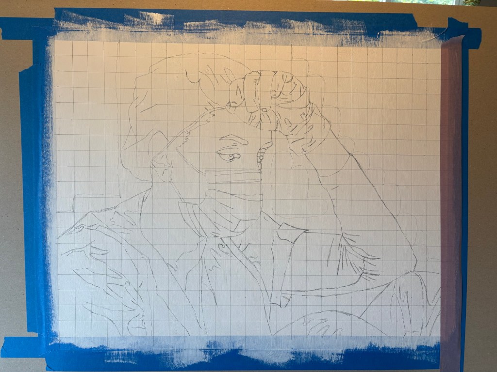 It took me longer than I planned to transfer the figure onto the watercolor paper. Even using a grid, penciling the sketch took two hours. So I didn’t get to any painting today but tomorrow I will outline the lines I drew and paint in the background. I’m going to use titian green (one of my favorite colors) like I have with my previous three PPE works. This time I don’t think I’ll put any lines in around the figure because she is already so close to the edge of the paper that the composition might be a bit wonky if I added lines.