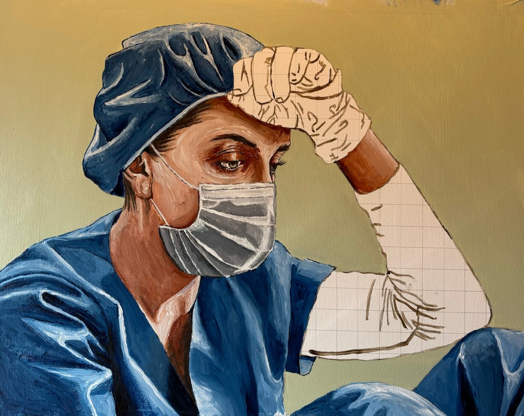 Outline photo, grid, print out gridded drawing, grid watercolor paper Wednesday Sep 25 Draw figure onto gridded watercolor paper Friday Sept 27 Outline drawing and paint in background. Saturday Sept 28 Paint eyes – Sunday Sept 29 Paint skin – Monday Sept 30 Paint shirt – Tuesday Oct 1 Paint hairnet – Wednesday Oct 2 Paint mask – Thursday Oct 3 Paint knees — Sunday Oct 6 Paint sleeve – Wednesday Oct 9 Paint glove – Thursday Oct 10