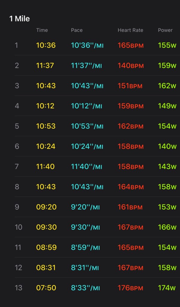 I took it really slow the uphill part of the run so I could save my energy for speeding up downhill. Here is how it split up, you can see my speed increased hugely towards the end: