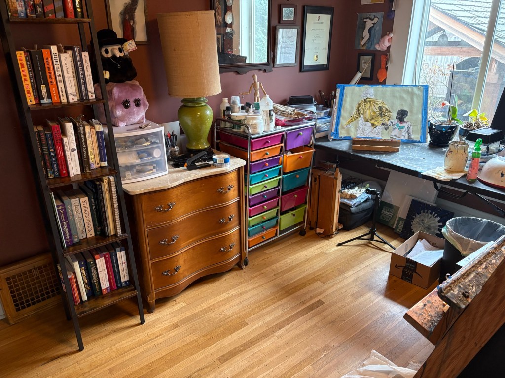 I spent the past week getting the house ready for the deep clean and cleaning the places that they will not be doing (the art studio, the basement, and the mud room). I didn’t quite get the motivation to declutter my art studio entirely but I did clean it. I dusted, swept, and put stuff away that was on surfaces. My painting table can be used again, my desk is clear for drawing, bookshelves only have books on them now, and the electronics area is tidied up.
