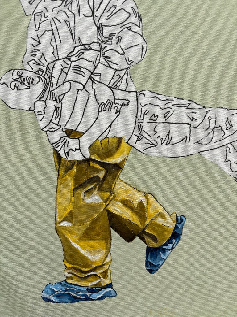Today I worked on the legs of the left suited figure and finished them. I have three more days to finish this person which should be adequate. Next week I will tackle the boy being held up between the two men. Then I should be done with the painting in time to submit to the March show at Splendorporium (the deadline is the 25th of February).