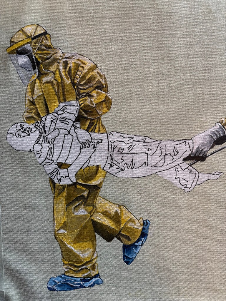 Today I finished the left suited figure. The face shield was tricky to render but I think I got it looking alright. Now that I’m done with the plastic suits I can tackle a normally clothed person with skin showing. Sometimes skin is really tricky to do in acrylic because it comes out looking pretty flat toned. This person’s face is largely in shadow and they have dark skin, so it might look okay. Pale skin in acrylic can come out looking a bit cartoonish.