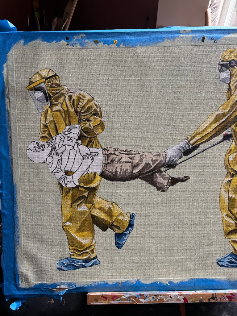 - Working on my new PPE painting and finishing the left suited figure by the end of Sunday – Achieved!