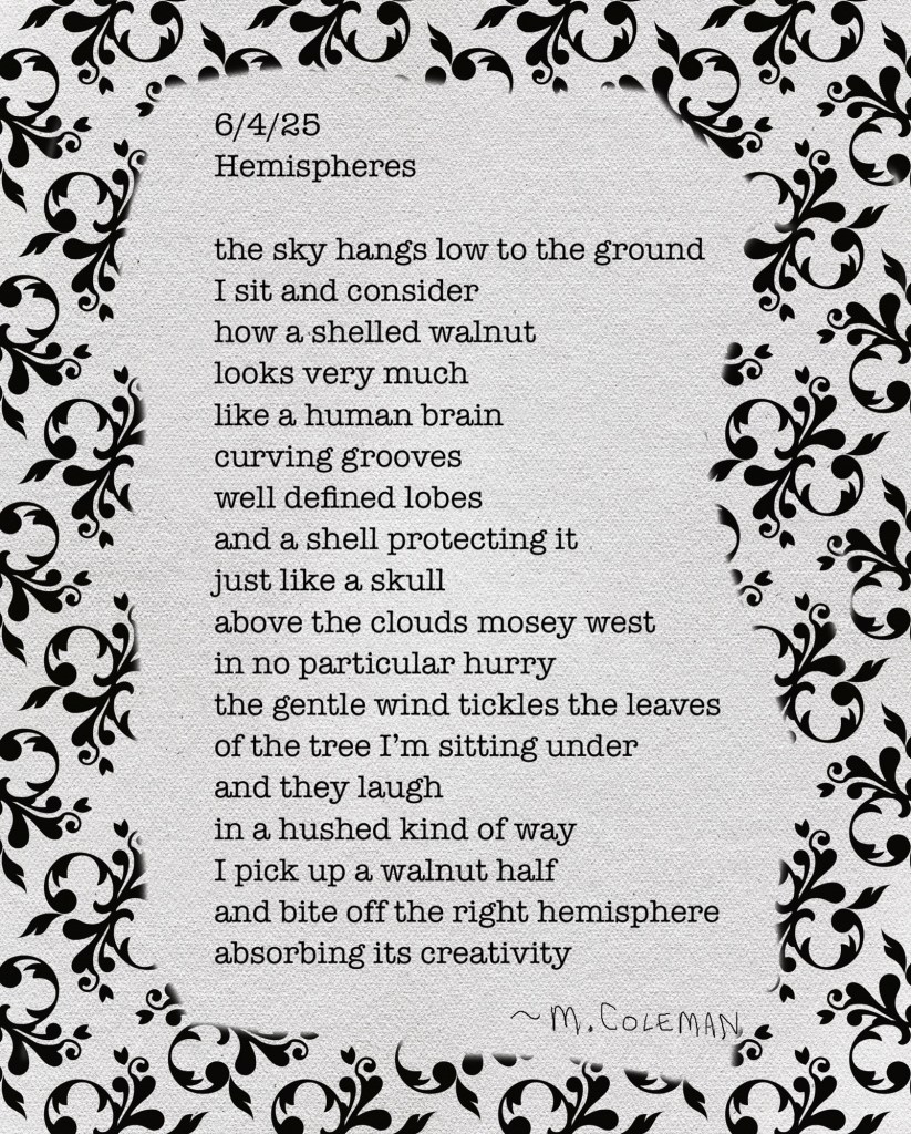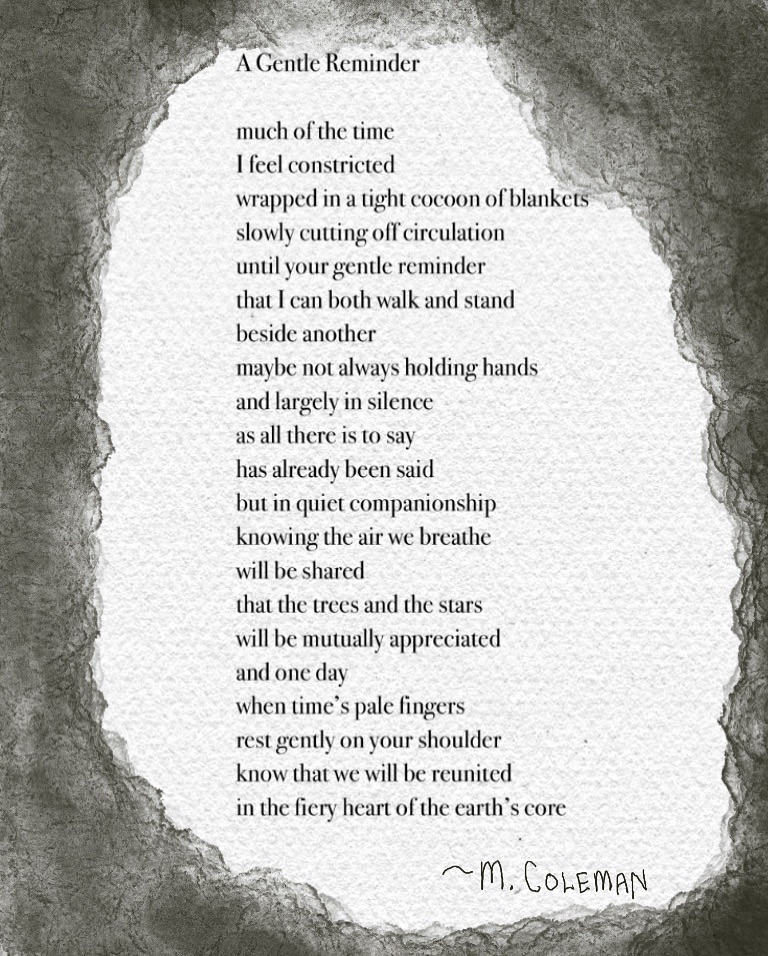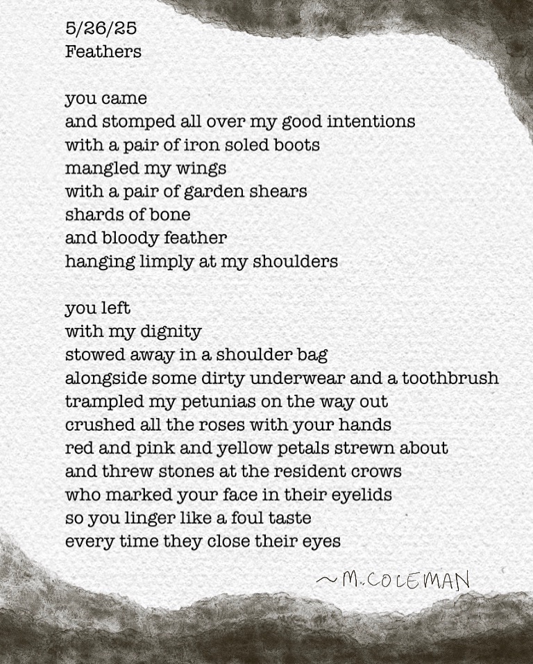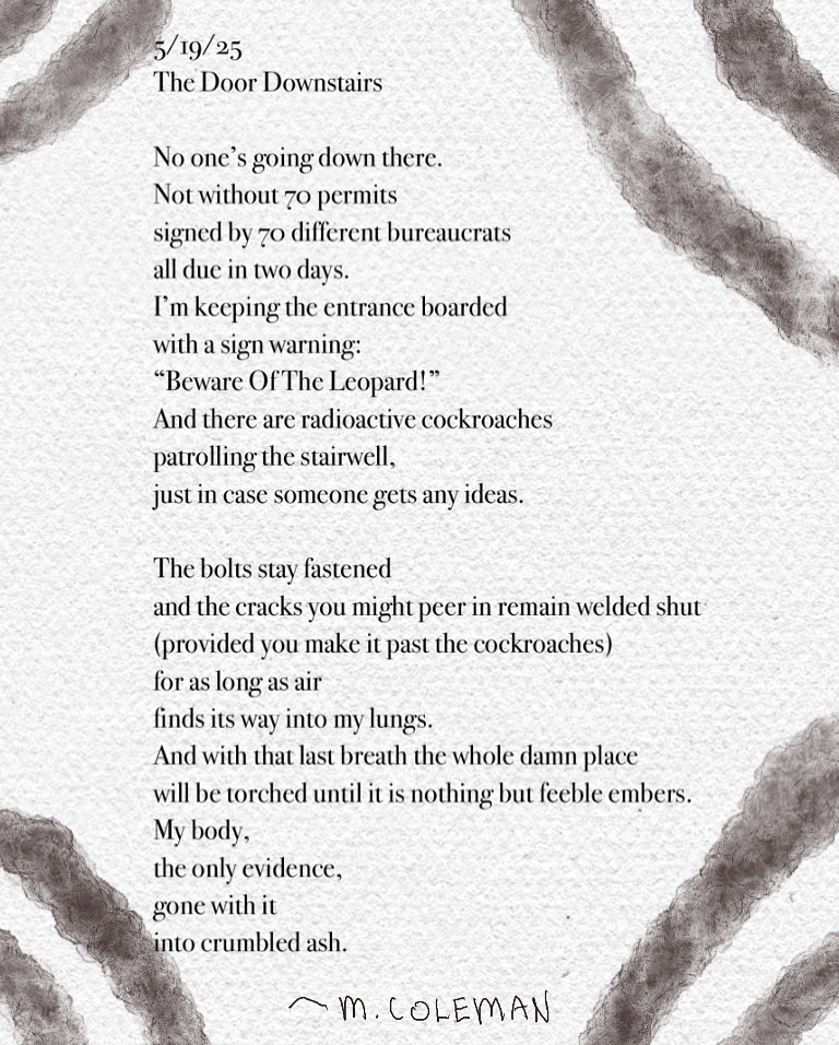 For the rest of spring and for summer I’m trying to get 1 to 2 poems done a week. If I can do more, great, but I’m not pressuring myself to produce an entire piece on a daily basis.
