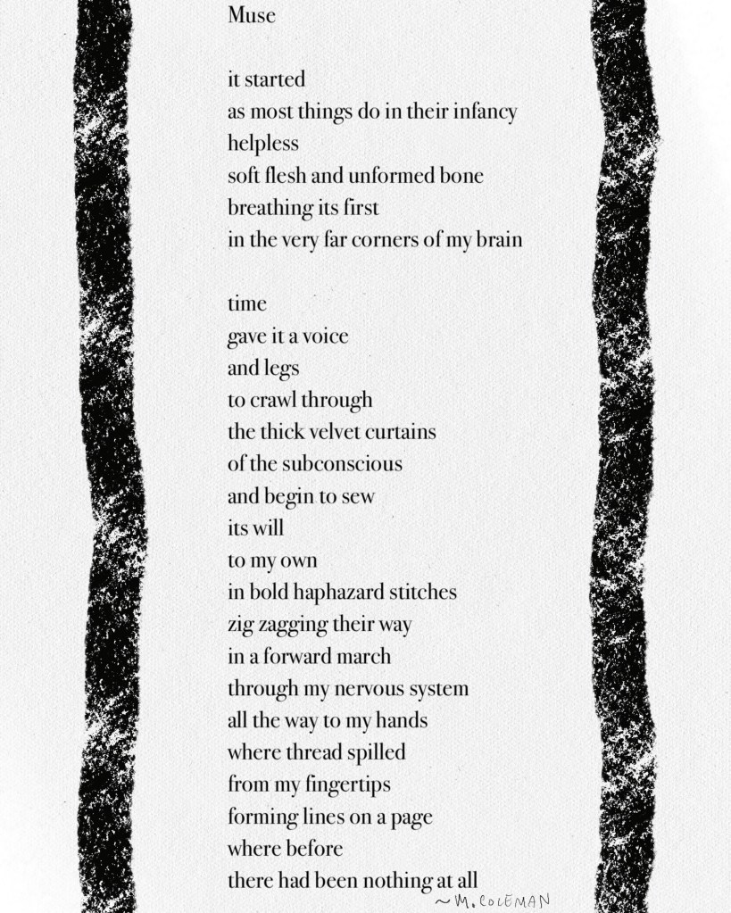 Even if I could, I don’t think I’d take a poetry class to try to make sense of it all. That would rob me of my raw creativity like it did with my visual art when I went to art school. I like having a channel to my subconscious that I don’t quite comprehend with my conscious brain. I don’t want things to have a clear meaning or a way of being deciphered. Other people’s poetry, and especially my own, is best left to the subconscious because I trust some part of me picks up a meaning, even if I’m not fully aware of that happening. It comes out in my writing, so something is soaking in.