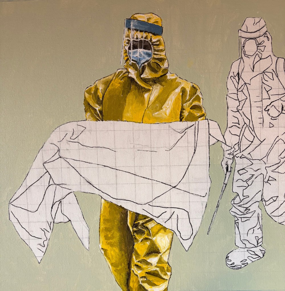 So I finished the top and bottom of the larger figure in my painting. Tomorrow I am going to work on the body bag. Overall I am pretty happy with this so far. Painting folds is really calming, almost meditative.