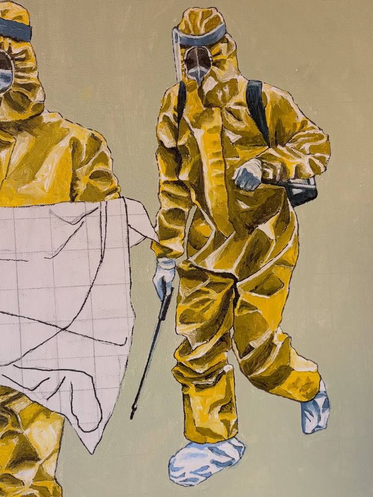 So I finished the smaller figure. Pretty happy with how it turned out. Took me about 4 hours in total to get him done. Tomorrow I tackle the body bag that the larger figure is holding and then I will be entirely done with the whole painting. Not sure what I will do next, I may feel like another PPE painting, I may feel like doing some illustrations. We’ll see where the next week takes me.