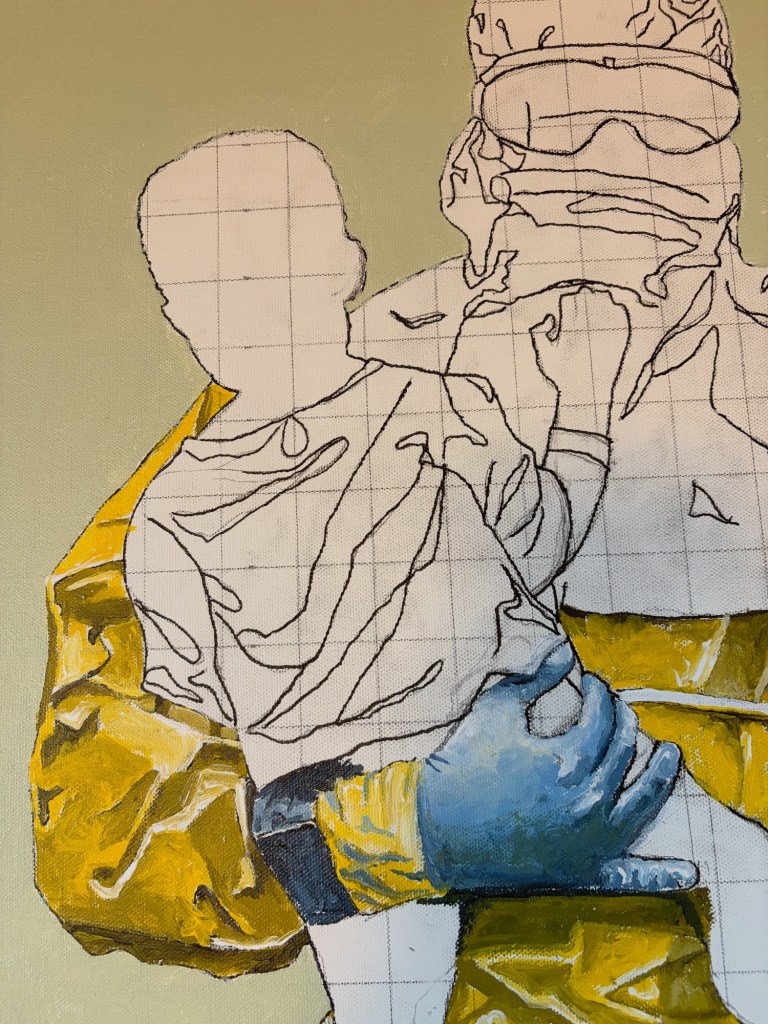 I have made some progress on my new PPE painting. I’m going a bit slower with this one. Haven’t felt like painting for more than around an hour at a time. I will try to get in more work than that tomorrow though. I’d like to finish the hood of the larger figure tomorrow if I can.