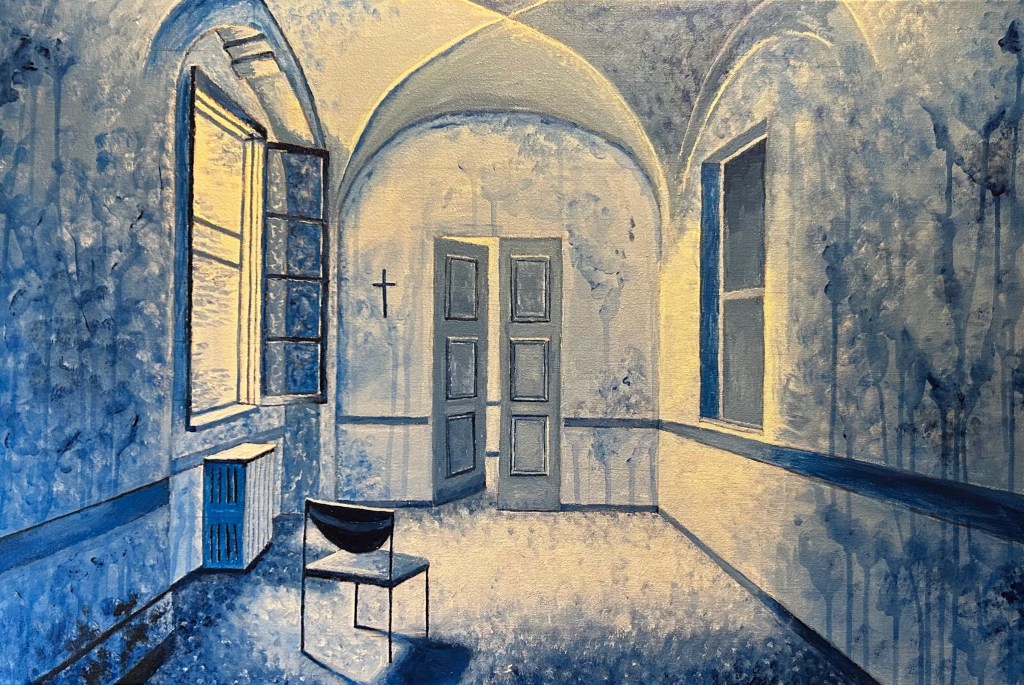 The Burning of Within Isolation Hospital. Acrylic on canvas. Fall 2021. 24 x 36 inches.
